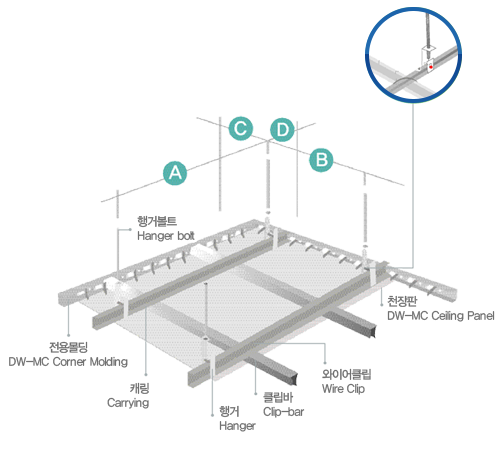 DW-METAL BOARD는 친환경 금속 천장재 이며 반영구적인 DW-METAL BOARD를 기존 석고보드(석면텍스) 해체 후 고정되어 있는 M-BAR에 바로 시공할 수 있는 제품으로 시간단축 및 비용 절감이 가능한 DW-METAL BOARD 모듈 시스템입니다.